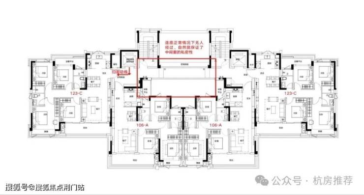 首先这个户型解决了中间套的隐私问题,如上图所示,两个边套回家都不需要经过连廊,所以保证了中间套的私密性。