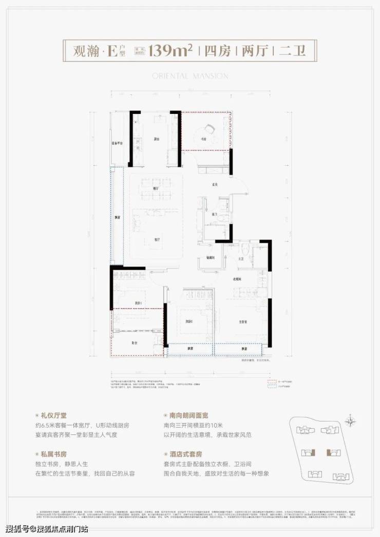 鸣澜里139平户型同样做的不错,打造四房两厅两卫,分为横竖两款,全部为边套,两梯两户设计。 其中,139平竖厅户型亮点分析:① 户型得房率超高, 达到约93%;② 南向3个卧室,采光优且满足二胎家庭和三代同堂居住需求;③ 客厅面积达到约37平,足够大,同时额外配置 约2.6平的储物间。