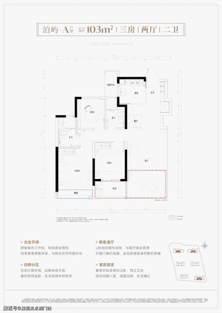 建面约 103平,三房两厅两卫。 三大亮点分析:① 南向三开间, 朝南次卧带阳台,客厅联通阳台后,空间阔绰;② U型厨房且半开放设计,玄关含 S墙冰箱位,利用率高、采光更优;③ 新规户型 得房率高达约90%以上。