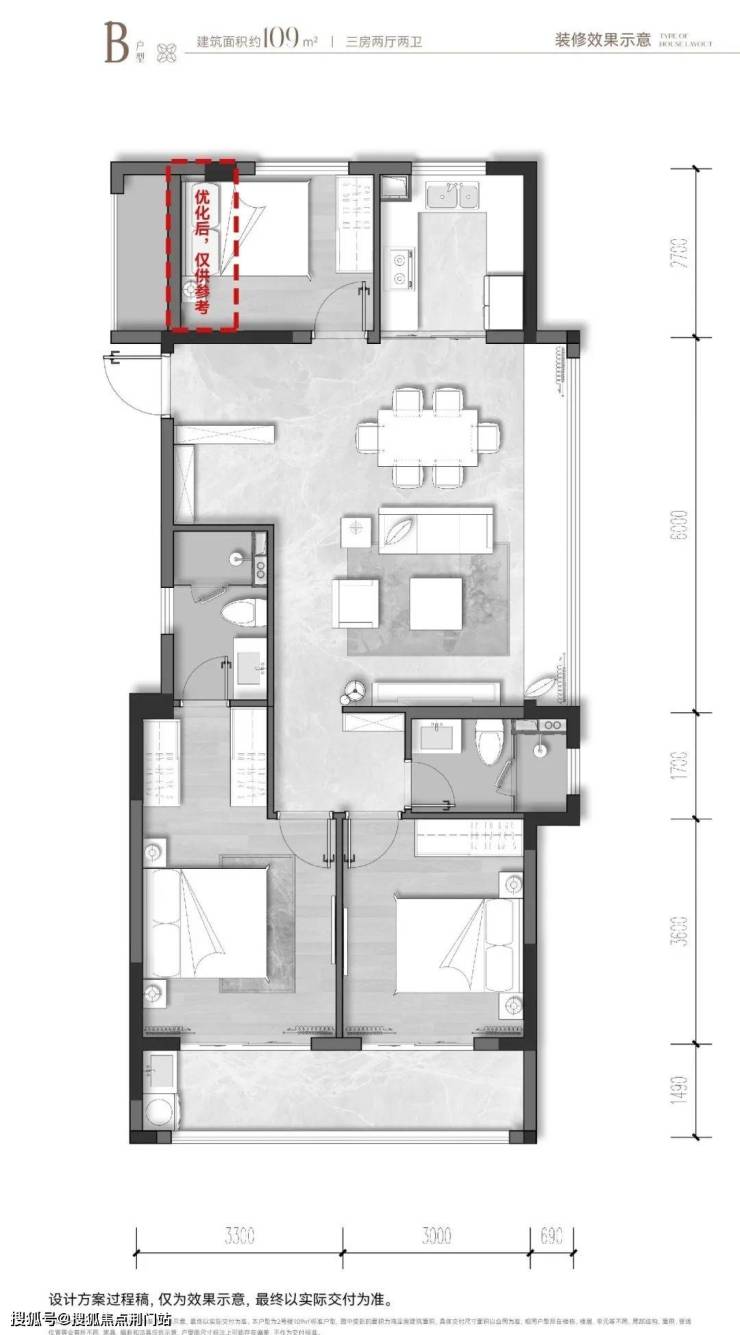 建面约109㎡三房两厅两卫户型。