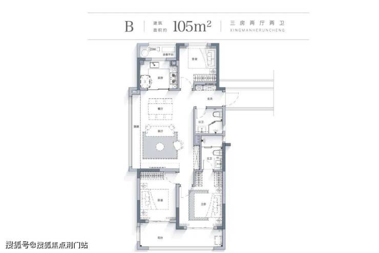 建筑面积约105方户型就设计出了备受年轻人喜爱的阔绰“横厅”,空间更加宽敞舒适。横厅的设计,让客餐厅融为一体,空间更开阔,增加了家庭聚会和娱乐的空间。