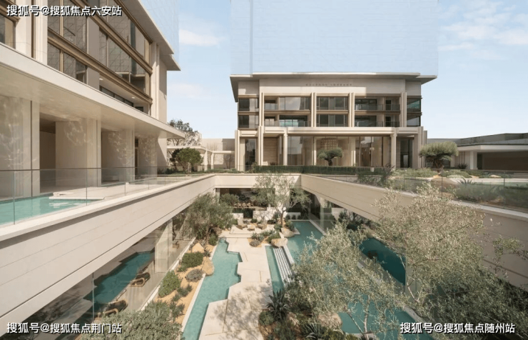 以希腊安缦酒店与Gundari度假村为灵感,引入地中海风情景观,通过莱姆石铺装、冰川蓝水景、沙生植物及20余棵千年油橄榄树,打造沉浸式度假体验。园区色彩采用低饱和度搭配,营造克制而高级的审美基调。