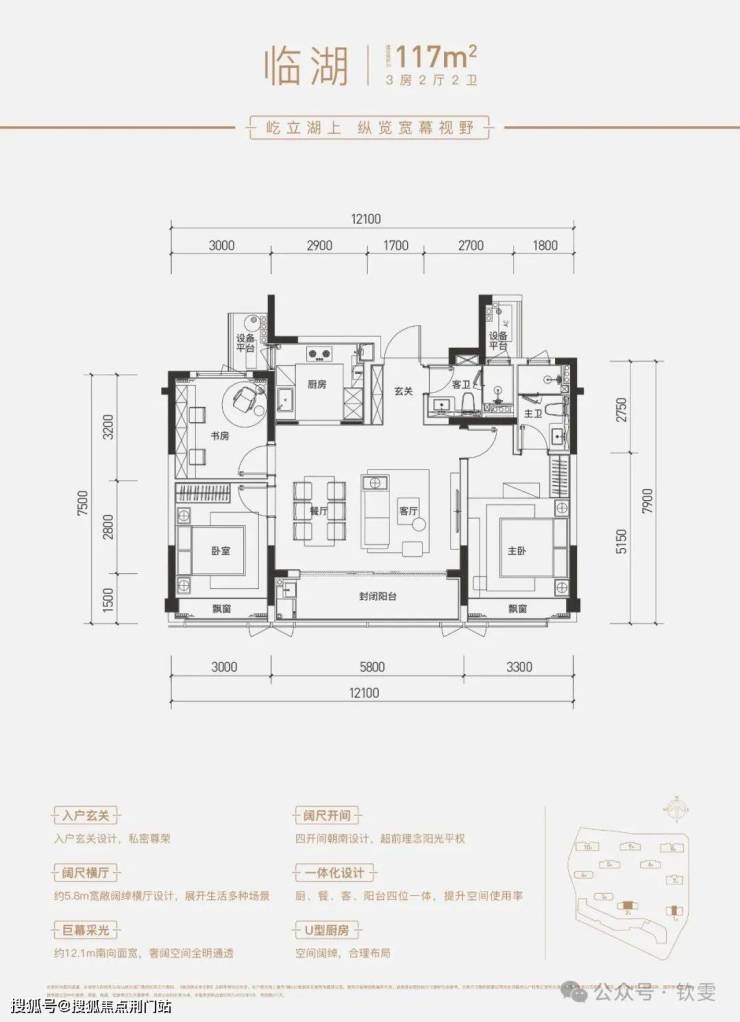 115㎡B三室两厅两卫:项目起步户型,主要分布于10#14#中间套,南向三开间面宽超12米,两房朝南,主卧套房设计,南向阳台面宽5.8米;